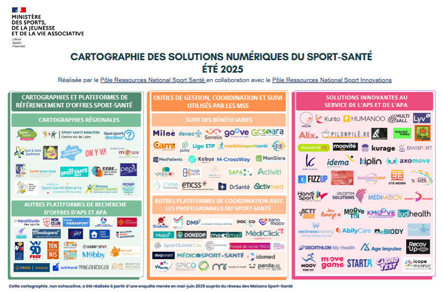 Pour promouvoir cet élan numérique, le Pôle Ressources National Sport Santé, en collaboration avec le Pôle Ressources National Sport Innovations, a réalisé une cartographie des solutions numériques au service du sport-santé en France.